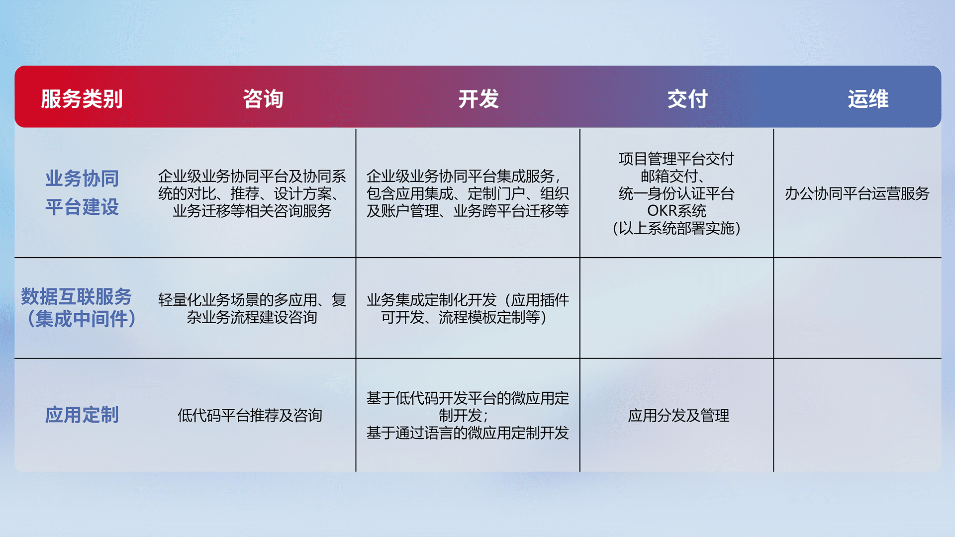针对钉钉、、、企微、、、、IDaas等平台级产品提供产品的规划、、、方案、、、、交付、、定制化开发等服务,,,实现如统一协同办公、、、智能客户服务、、、混合会议管理、、智能数据查询、、等业务场景,,,,实现数字化转型。。